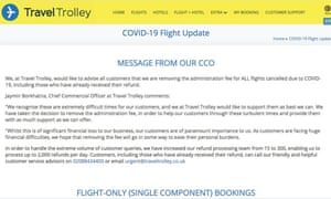 It referred the company to its legal team after the Observer alerted it. A notice has since appeared on Travel Trolley’s website announcing that it will cancel its fee and refund customers who have already paid it. “Whilst this is of significant financial loss to our business, our customers are of paramount importance to us,” it says. “As customers are facing huge financial difficulties, we hope that removing the fee will go in some way to ease their personal burdens.”