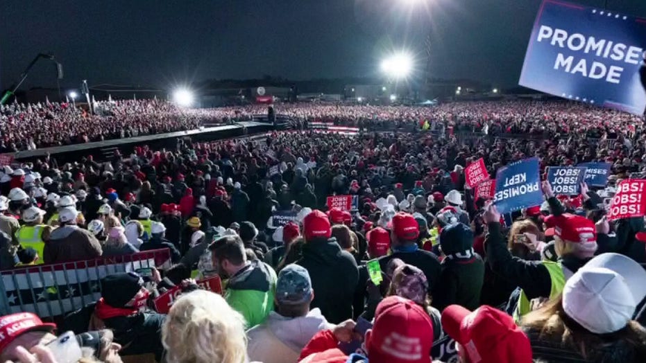 Trump supporters hold up four fingers as they chant ‘Four More Years at President Trump’s campaign rally in Butler, Pa. Saturday.