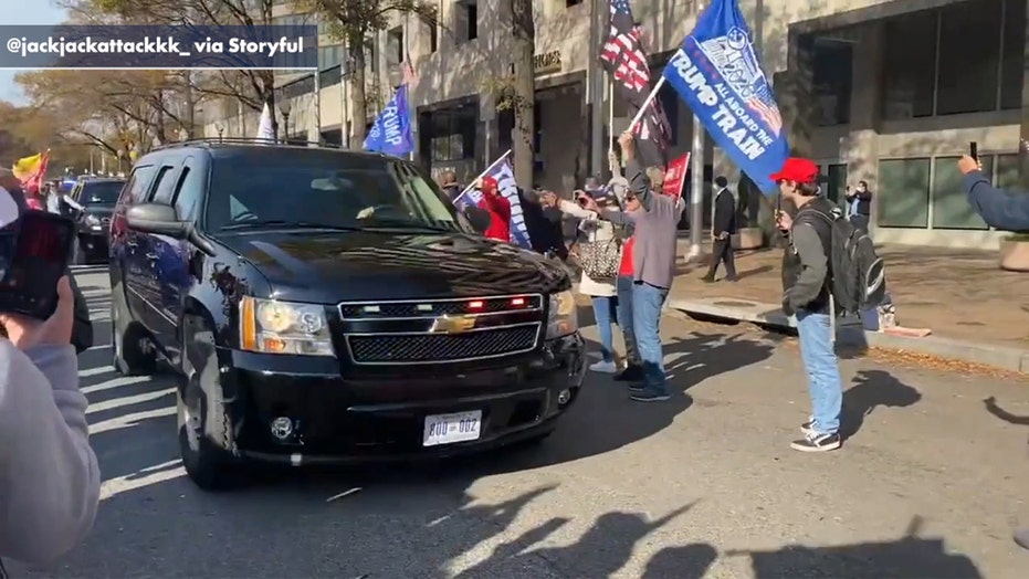 President Trump waves to the crowd from his motorcade during a march in Washington, D.C. (Credit: @jackjackattackkk_ via Storyful)