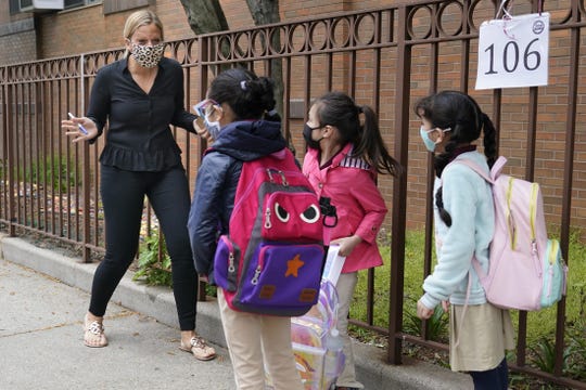 Teacher Amanda O’Connor greets members of her first grade class in front of Christa McAuliffe School in Jersey City, N.J., on Thursday. (Photo: Seth Wenig/AP)
