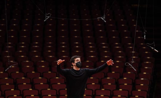 Indianapolis Symphony Orchestra conductor Jacob Joyce raises his arms while conducting a dress rehearsal March 10, 2021, at the Hilbert Circle Theatre in downtown Indianapolis. (Photo: Grace Hollars/IndyStar)
