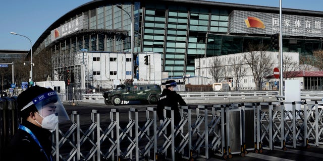 Chinese security stand guard outside the National Indoor Stadium ahead of the 2022 Winter Olympics, Wednesday, Feb. 2, 2022, in Beijing.