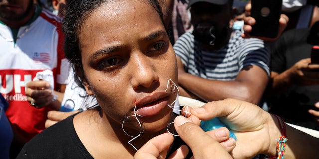 A migrant begins a hunger strike with her mouth sewed shut during a protest in Tapachula, Mexico, to demand free transit through the country on Feb. 15, 2022 (Reuters/Jose Torres)